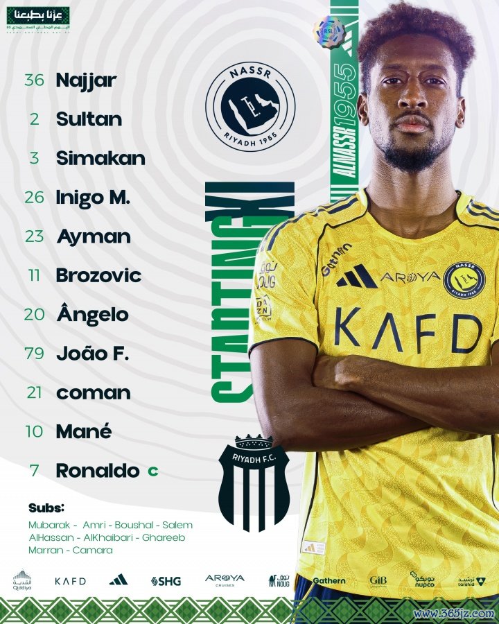 利雅得获胜 杆位:36-纳贾尔、2-苏丹·哈纳姆、3-西马坎、26-伊尼戈、23-叶海亚、11-布罗佐维奇、20-安吉洛、79-菲利克斯、21-科曼、10-马内、7-C罗