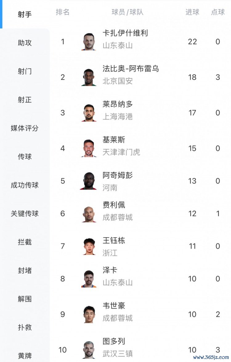 9月22日讯 中超第25轮昨晚结束,射手榜方面,