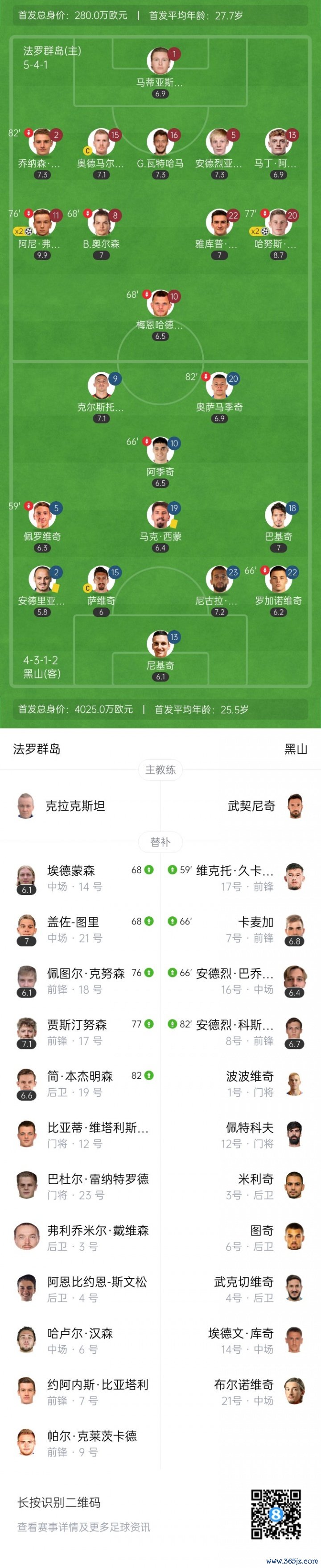 对比两队的阵形 ,英超直播法罗群岛的杆位11人身价仅280万,大部分球员都在本土职业联赛 效力;而黑山锋线坐拥两位在意甲效力的球员,亚特兰大的克尔斯托维奇和尤文的阿季奇,杆位11人身价4025万欧。