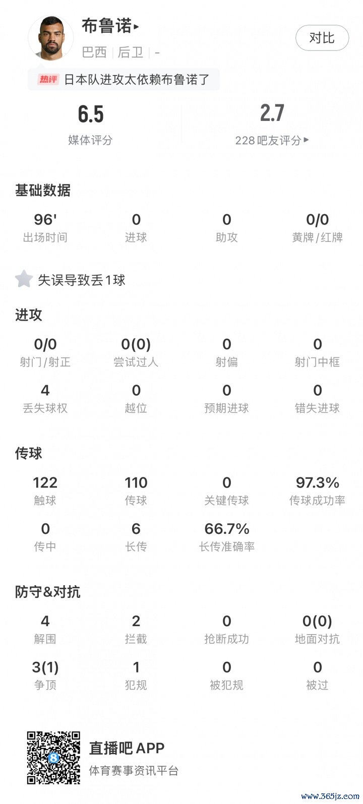 此役,巴西杆位中卫布鲁诺上演灾难级别表现,