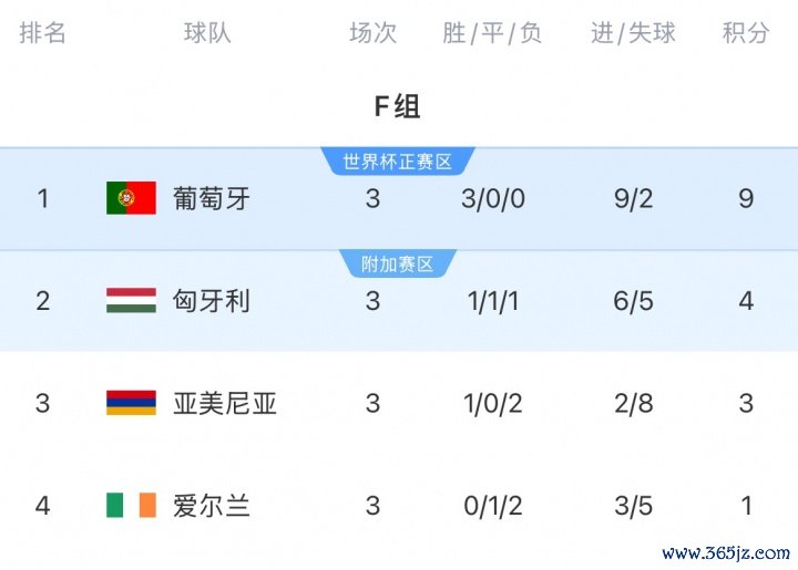 此外葡萄牙3轮全胜积9分领跑 匈牙利5分,今夜葡萄牙若击败匈牙利,且亚美尼亚不胜的话,葡萄牙即可提前锁定世界杯赛 席位。