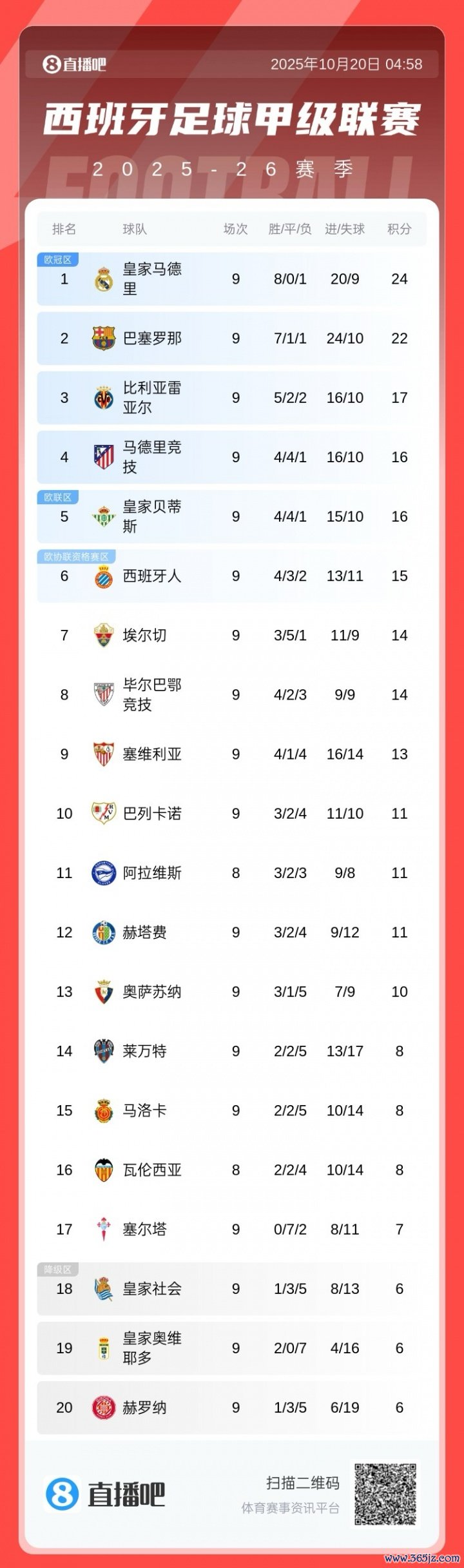 巴萨排名第二, 体坛快讯通直播吧比利亚雷亚尔第三, 里尔马竞第四。西甲第10轮10月26号将迎来国家德比,皇马主场作战 迎战巴塞罗那。