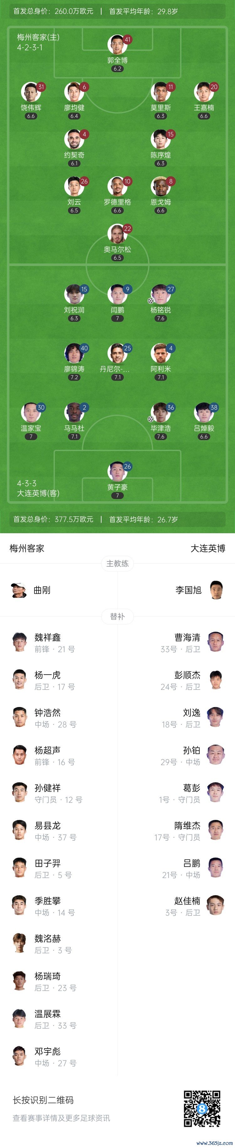 11月1日讯 北京时间19:35西甲积分榜,中超第29轮梅州客家vs大连英博,赛事 在梅州五华奥体中心打响!上半场,闫鹏中柱;杨铭锐反击中帮助大连英博取得领跑 !毕津浩顶球补射再下一城。半场结束,梅州客家主场作战 暂时0-2追赶 大连英博!