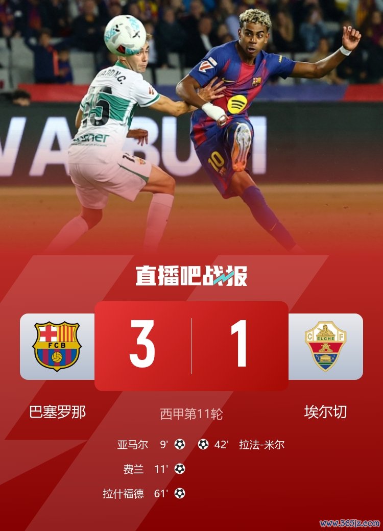 距榜首5分!巴萨3-1埃尔切升至职业联赛 第二 亚马尔费兰拉什福德破门