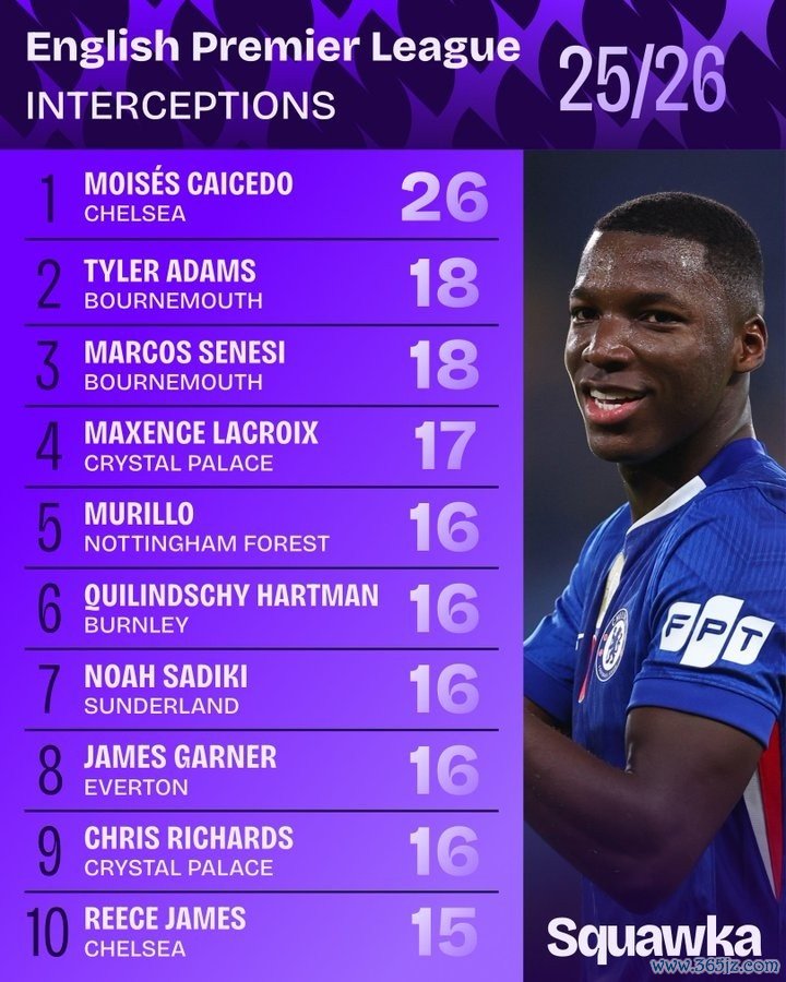 11月11日讯 英超职业联赛 已经进行了11轮,squakwa也统计了本赛季英超阻拦 次数情况,直播吧凯塞多独自领跑。