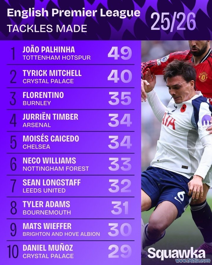 11月11日讯 英超职业联赛 已经进行了11轮,squakwa也统计了本赛季英超抄截 次数情况,NBA直播拜仁外租的帕利尼亚居首。