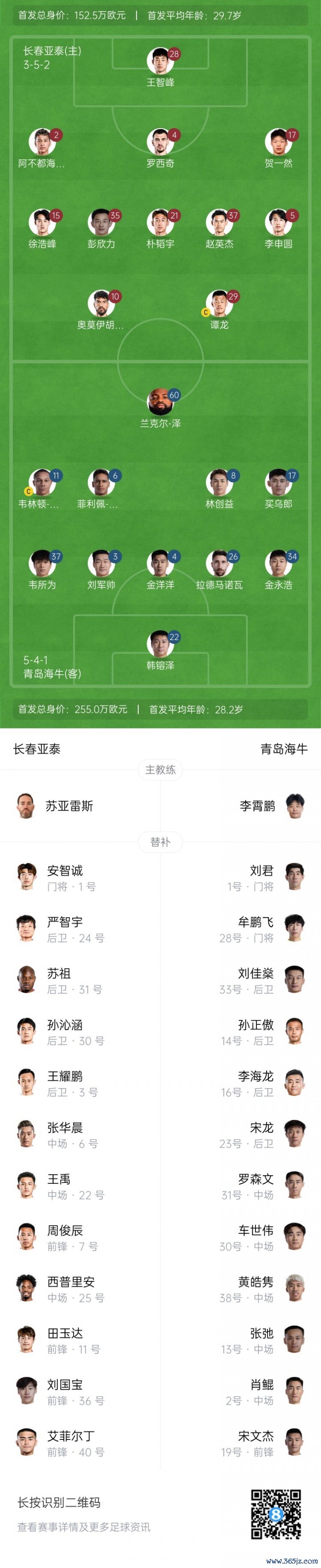 长春亚泰后备 :1-安智诚、3-王耀鹏、24-严智宇、30-孙沁涵、31-苏祖(F)、6-张华晨、22-王禹、25-西普里安(F)、7-周俊辰、11-田玉达、36-刘国宝、40-艾菲尔丁