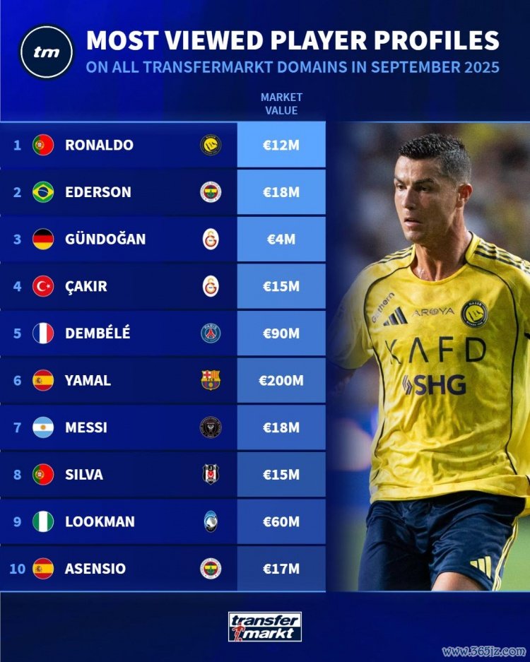 德转球员页面9月浏览量排名:C罗居首,埃德森第二、梅西第七