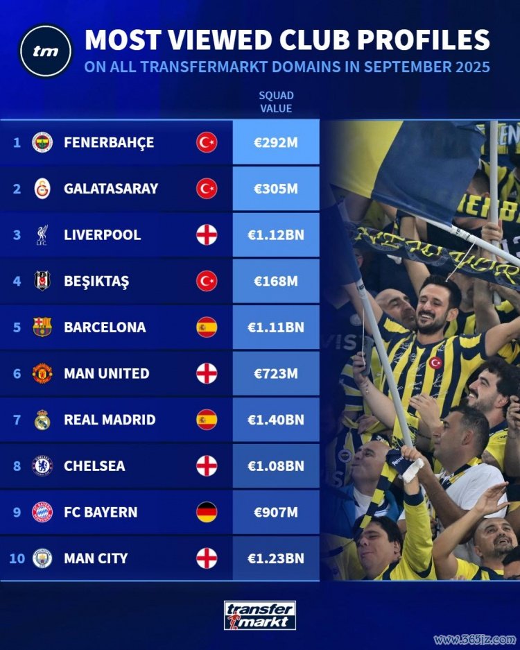 10月5日讯 德国转会市场列出了9月份球员页面浏览量排名,C罗居首,欧冠直播吧埃德森、京多安二三位,