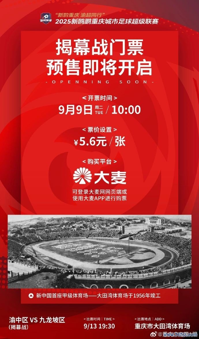 球迷可以通过大麦平台搜索“重庆城市古代足球 超级职业联赛 ”在线抢票五洲集团, 里尔赛事 将于9月13日在重庆大田湾运动场 进行。