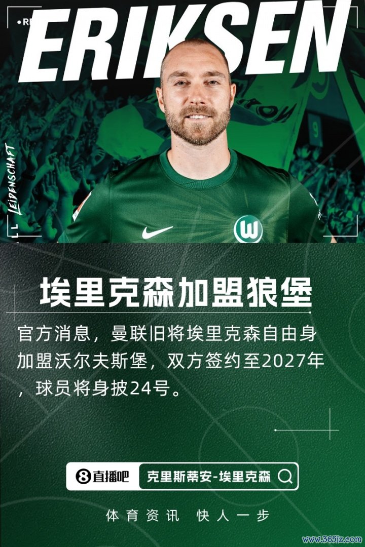 09月11日讯 官方消息,曼联旧将埃里克森自由身加盟沃尔夫斯堡,双方签约至2027年,欧冠足球直播球员将身披24号。