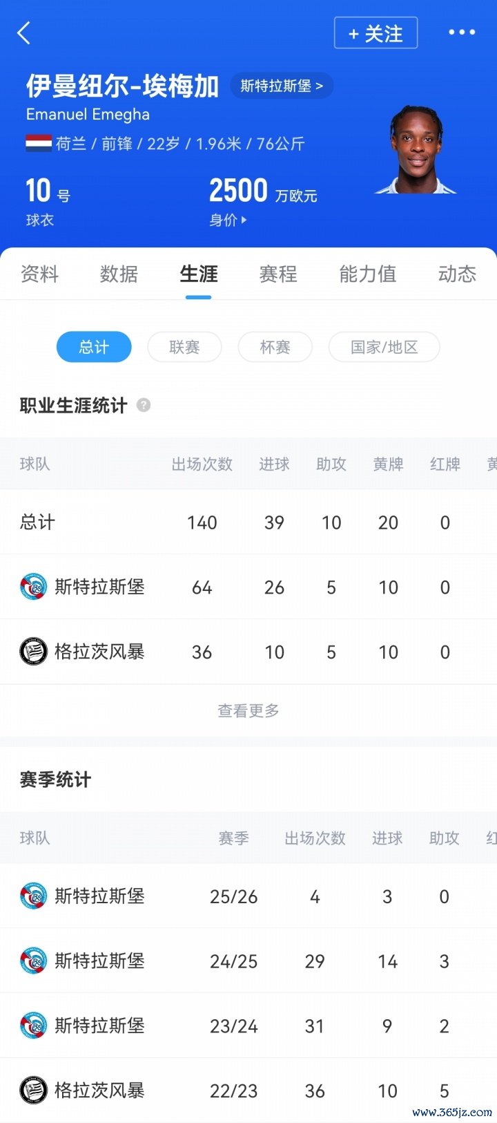 荷兰前场球员埃梅加现年22岁,身高1米96,上赛季代表斯特拉斯堡出战29场赛事 ,打进14球,助功 3次。目前埃梅加的德回转 价为2500万欧元。