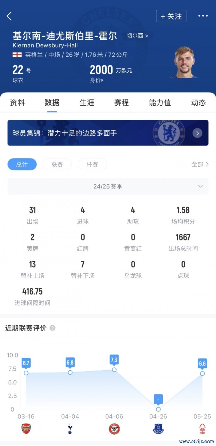 26岁的霍尔去年夏窗以3540万欧元转会费从莱斯特城加盟切尔西,上赛季为切尔西出场31次贡献4球4助。球员目前的身价为2000万欧元。