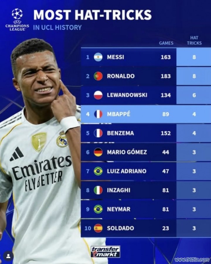 欧冠历史独中三元次数榜:梅西、C罗8次最多,姆巴佩4次第4