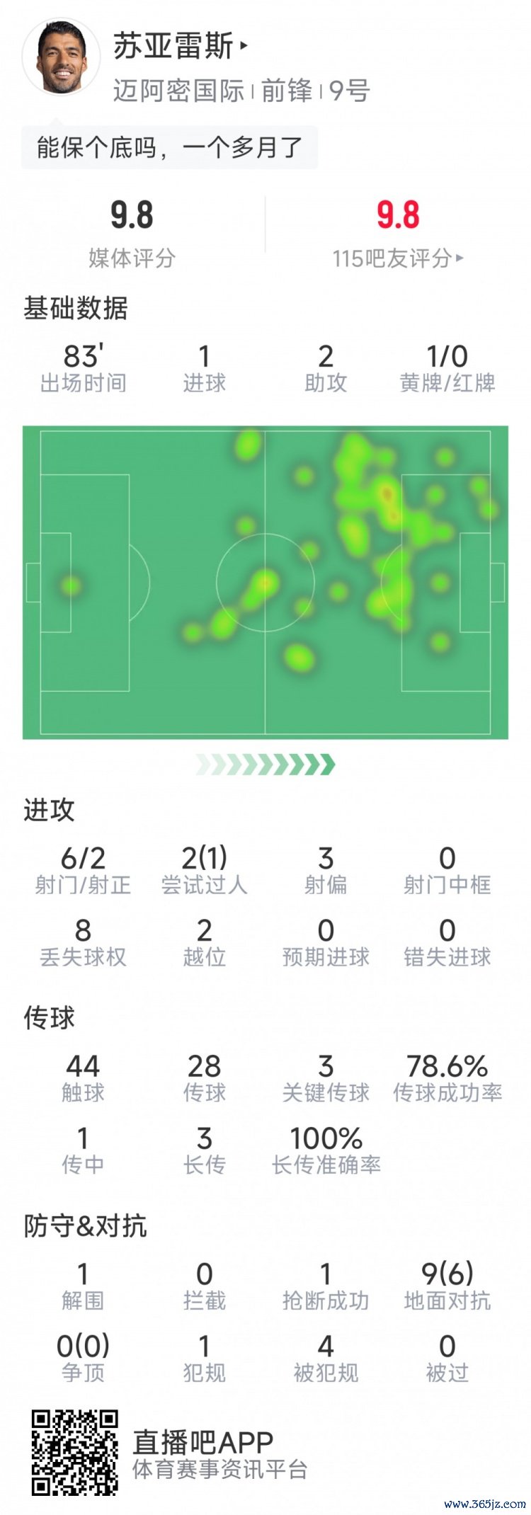 8月7日讯 在联盟杯小组赛迈阿密国际对阵墨西哥美洲狮的赛事 中,苏亚雷斯杆位出战表现出色, 体坛快讯通足球直播以下为他在本场数据:
