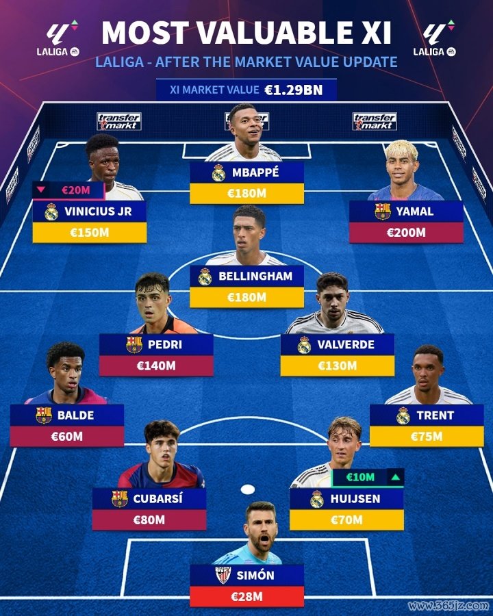 前场球员:维尼修斯-1.5亿欧,姆巴佩-1.8亿欧,欧冠亚马尔-2亿欧